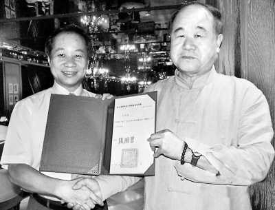 據臺灣媒體報道,臺師大校長張國恩4日上午帶領該校文學院院長、國際與僑教學院院長、國文係主任以及應用華語文學教授等人,在臺北與媒體茶敘時宣布,已成功延攬並禮聘到大陸諾獎得主莫言擔任該校講座教授,同時還拿出莫言接受聘書時與張國恩的合影(見圖)。