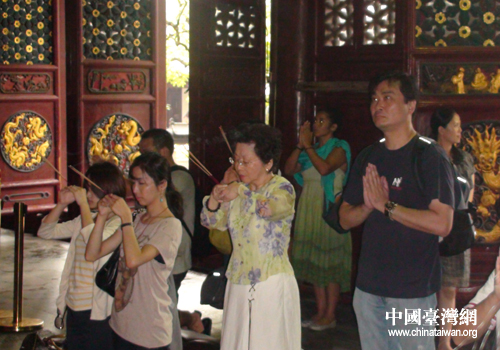 陳彩蓮女士一行在普濟寺敬香(圖片來源:舟山市臺辦)