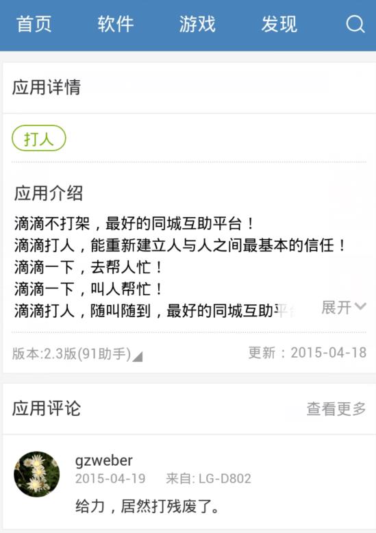 相信很多人都用過“滴滴打車”這款軟件,可是你見過“滴滴打人”嗎?4月17日有媒體報道,一款名為“滴滴打人”的APP出現在安卓手機係統應用平臺上。在常用的360手機助手、豌豆莢等應用平臺都能搜索到這款軟件。記者打開淘寶手機助手,搜索“滴滴打人”,果然發現了這款APP。(4月19日《北京青年報》)
