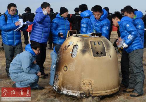 飛行器返回地球使用蘇聯設計的技術,先在大氣層彈起,以降低進入的速度以及避免燃燒。返回器于11月1日淩晨在內蒙古著陸。