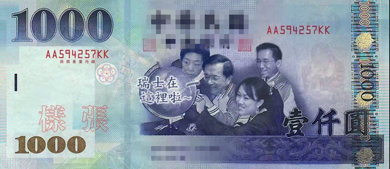“新”臺幣將千元鈔上“四個小朋友”的圖案,換成涉貪的前臺灣地區領導人陳水扁一家四口人的肖像。當年陳水扁把錢貪污後存在瑞士,所以錢幣上陳水扁一家正在地球儀上找瑞士(網絡圖)