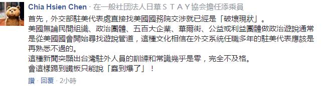 還有專業知識豐富的網友表示,“臺駐美代表處直接找美國國務院就是破壞現狀了,美國無論民間組織、政治團體、五百大企業、華爾街、公益或利益團體做政治遊說通常是從美國國會開始尋找遊說管道,這種新聞突顯出臺灣駐外人員的訓練和常識幾乎是零,完全不及格。”