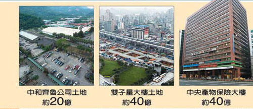 “中央投資公司”持有的多筆不動產最具價值,尤其是臺北車站旁的產物保險大樓、捷運雙子星大樓預定地及中和齊魯公司土地,若開發得當,至少值百億元以上。