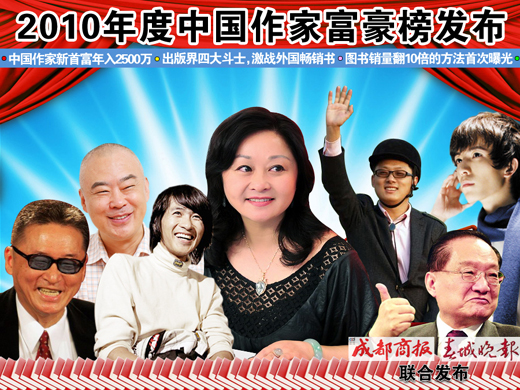 今天,《2010年度中國作家富豪榜》在成都商報重磅發布,楊紅櫻、郭敬明、鄭淵潔分別以2500萬元、2300萬元、1950萬元的年版稅收入成為今年作家富豪榜的三甲,值得一提的是,他們三人均已連續三年位居中國作家富豪榜三甲之列,並且輪流佔據這三年作家富豪榜的榜首位置。至今年為止,中國作家富豪榜已經在成都商報連續發布四年,從郭敬明最初的1100萬元到今年楊紅櫻的2500萬元,如果將版稅換算成作品銷售數量,這也顯示出,中國作家首富的讀者在急劇增加。然而,一個嚴峻的現實是,在數字閱讀悄然發展的今天,作家們卻幾乎無法從這一塊獲得他們應得的版稅,易中天說自己沒有從數字出版拿到一分錢,他猜測自己可能從中“丟掉了一棟別墅”!這並非個例,因為絕大多作家都沒在這一領域拿到版稅。而就在中國作家富豪榜發布之時,中國作家們剛剛發起了一次抗擊網絡數字侵權的活動。
