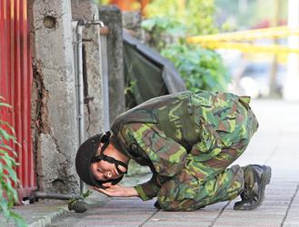 臺北市重陽路一資源回收場馬路旁驚見手榴彈 臺防爆隊員全副武裝檢驗。(圖片來源:臺灣《聯合報》)
