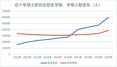 在相關政策的推動下,碩士研究生招生總人數中,專碩招生人數增長明顯。2017年起,專碩招生人數突破40萬,首次超過學碩招生人數。到2020年專碩招生人數超過60萬人,並與學碩招生人數之間差距逐漸拉大。