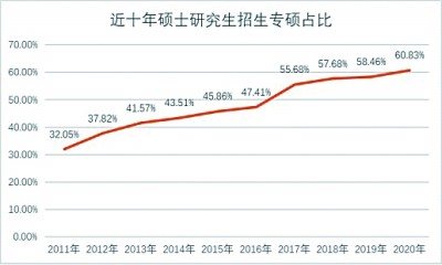近十年碩士研究生招生中,專碩佔比逐年提升,2020年佔比超過60%。