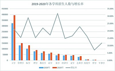 2020年研究生招生總量較上一年增長20.73%。從各學科增長率方面看,農學是增長率最高的學科,達到了31.85%。其次是醫學,招生人數增長率達到了29%。