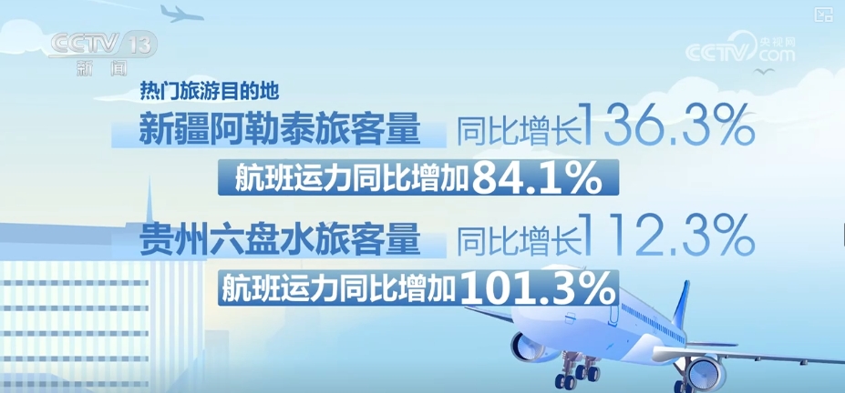 熱門旅遊目的地如新疆阿勒泰、貴州六盤水的旅客量同比增長136.3%、112.3%,航班運力同比增加了84.1%、101.3%。