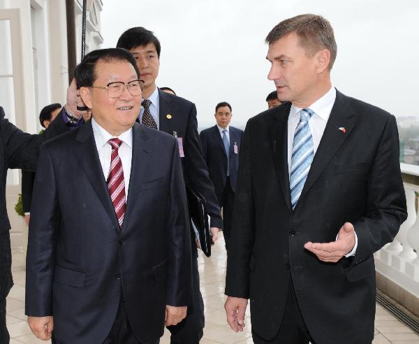 當地時間9月21日,中共中央政治局常委李長春在塔林會見愛沙尼亞總理、改革黨主席安德魯斯·安西普。 新華社記者 馬佔成 攝