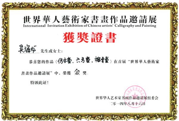 2014年8月16日,吳海龍大師倣古壺、六方壺、榴香壺作品在首屆世界華人藝術家書畫作品邀請展中榮獲金獎。