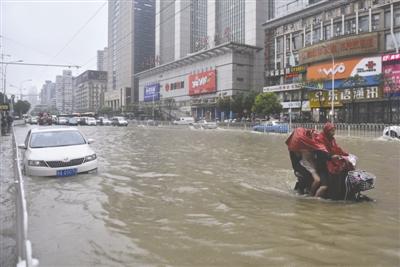 昨日,武漢一處路口積水過深,交通受阻 圖據新華社