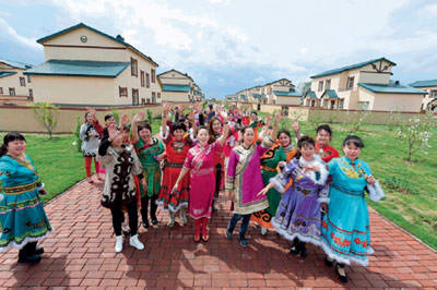 黑龍江省同江市八岔村的赫哲族群眾在新居前合影(5 月25 日攝) 新華社記者王建威攝