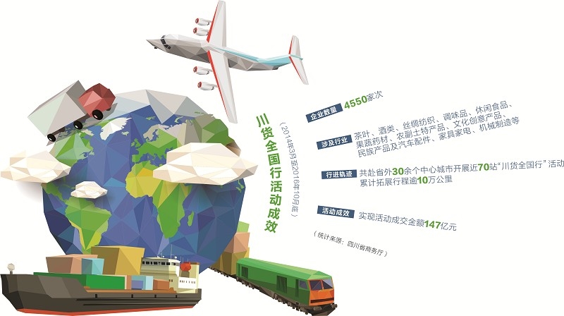 自2014年省政府組織開展市場拓展“三大活動”以來,截至今年10月底,川貨全國行已累計組織了4550家次企業,赴省外30余個中心城市開展了近70站川貨全國行活動,行程累計逾10萬公里,實現活動成交金額147億元。