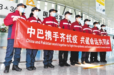 日前,中國赴巴基斯坦抗疫醫療專家組成員在烏魯木齊國際機場參加出徵儀式。新華社發