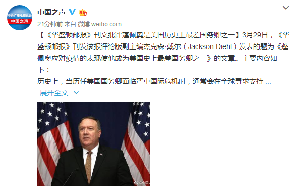 3月29日,《華盛頓郵報》刊發該報評論版副主編傑克森·戴爾(Jackson Diehl)發表的題為《蓬佩奧應對疫情的表現使他成為美國史上最差國務卿之一》的文章。主要內容如下:
