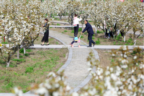 春分至,梨花開。遊客漫步在湖南衡陽珠暉區茶山坳鎮堰頭村金甲梨園,賞花拍照。珠暉區融媒體中心唐蘭榮 攝