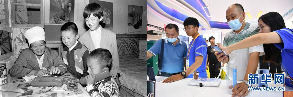 這是一張拼版照片:左圖為1996年,在寧夏西吉縣興隆鎮,靠加工牛百葉走上了富裕路的馬雪玲(左一)和子女一起打電話向外地做生意的丈夫問好(新華社記者劉泉龍 攝);右圖為2021年5月8日,觀眾在海南舉行的首屆中國國際消費品博覽會廣東展區體驗新款手機(新華社記者郭程 攝)。新華社發