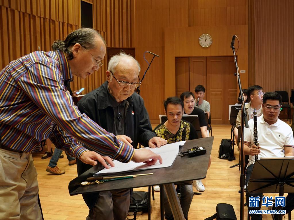 6月9日,呂其明(左二)在上海愛樂樂團錄制管樂版《紅旗頌》的現場,與指揮林友聲討論樂譜。新華社記者 劉穎 攝