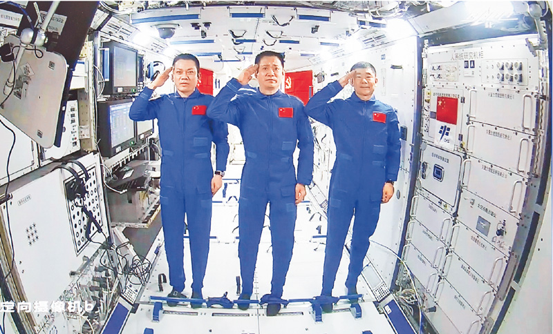 2021年6月17日,神舟十二號載人飛船成功發射升空,中國人首次進入了自己的空間站。6月23日上午,習近平總書記來到北京航天飛行控制中心,同正在天和核心艙執行任務的神舟十二號航天員聶海勝、劉伯明、湯洪波親切通話。圖為3名航天員精神飽滿,向總書記敬禮。 新華社記者 岳月偉/攝