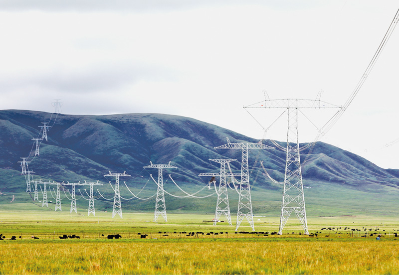 2020年7月15日,世界上首條主要輸送風光新能源的青豫特高壓開始輸電。源自青藏高原的太陽能、風能等清潔電力,跨過崇山峻嶺,源源不斷直送中原大地。隨著配套電源建設,青豫特高壓預計到2023年底可實現滿功率運行。屆時這條電力“高速公路”每年將輸送綠電412億千瓦時,相當于1/3個三峽大壩的發電量。圖為2021年6月17日在青海省黃南藏族自治州河南蒙古族自治縣拍攝的青豫特高壓直流工程。 新華社發 謝莉蓉/攝