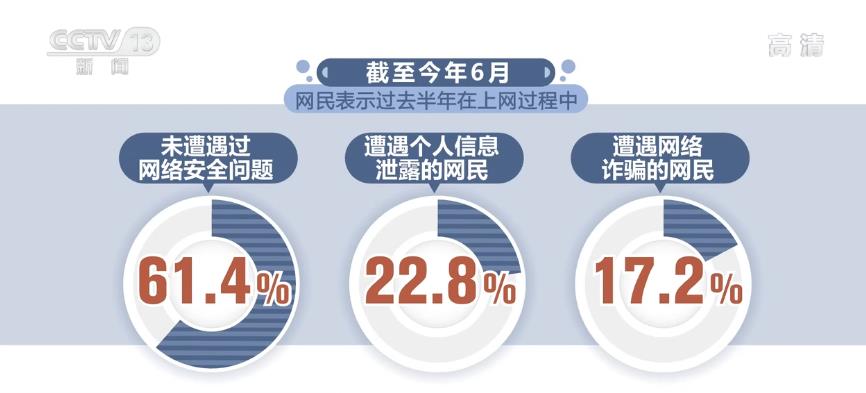《報告》顯示,截至今年6月,61.4%的網民表示過去半年在上網過程中未遭遇過網絡安全問題,與2020年12月基本保持一致,遭遇個人信息泄露的網民比例最高為22.8%,遭遇網絡詐騙的網民比例為17.2%。