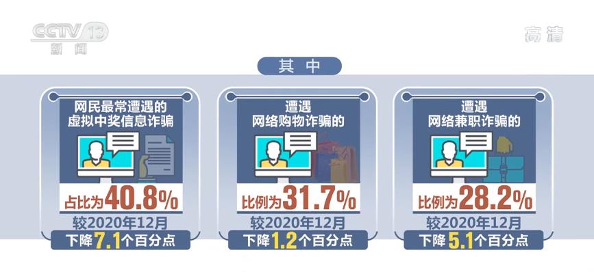 通過對遭遇網絡詐騙網民的進一步調查發現,網民遭遇多種網絡詐騙的比例均有所下降。其中,網民最常遭遇的虛擬中獎信息詐騙,佔比為40.8%,較2020年12月下降7.1個百分點;遭遇網絡購物詐騙的比例為31.7%,較2020年12月下降1.2個百分點;遭遇網絡兼職詐騙的比例為28.2%,較2020年12月下降5.1個百分點。