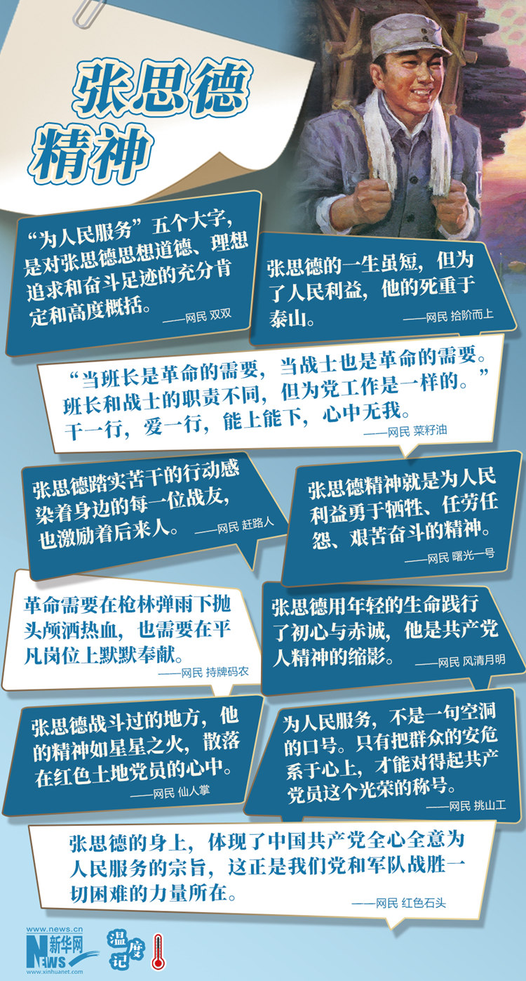 “張思德精神就是為人民利益勇于犧牲、任勞任怨、艱苦奮鬥的精神”,社交平臺上,網民們表達著對革命先輩的致敬,從他身上汲取奮進的動力。正如留言中說的那樣,我們黨來自人民、植根人民、服務人民,黨的根基在人民、血脈在人民、力量在人民。無論是革命戰爭年代,還是和平建設時期,正是因為把“全心全意為人民服務”作為一切工作的出發點和落腳點,我們黨才能保持同人民群眾的血肉聯係,才能團結帶領人民戰勝一個又一個艱難險阻,創造一個又一個人間奇跡。前進路上,我們要始終把黨“全心全意為人民服務”的根本宗旨銘記于心、踐之于行,不斷凝聚智慧和力量,繼續創造出無愧于黨、無愧于人民、無愧于時代的新的輝煌。(文字:徐可 海報設計:王曄)