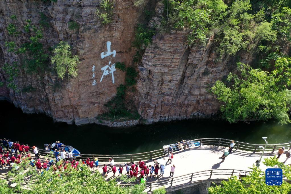 遊客在河南林州紅旗渠畔參觀(2019年5月22日攝,無人機照片)。新華社記者 馮大鵬 攝