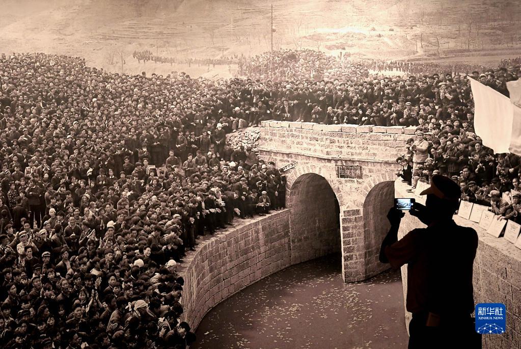 參觀者在紅旗渠紀念館拍攝展出的紅旗渠通水慶典照片(2019年7月4日攝)。新華社記者 李安 攝