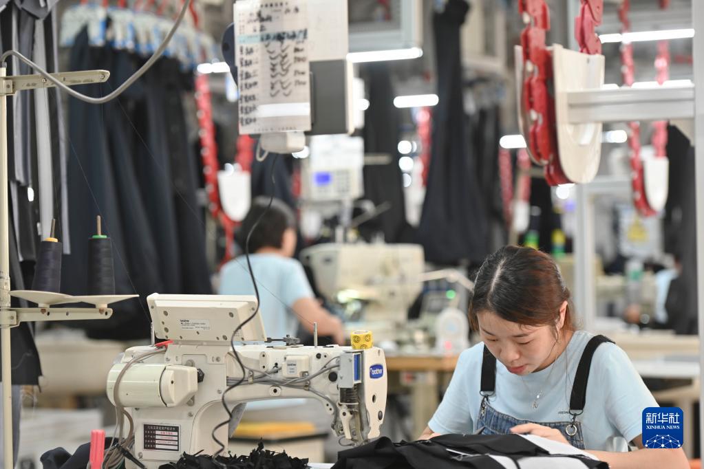 在位于福建省泉州市經濟技術開發區的九牧王西褲智能化生產車間,工人在自動化西褲吊挂流水線上作業(7月30日攝)。新華社記者 宋為偉 攝