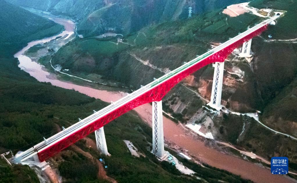 中老鐵路首發列車駛過中國雲南省元江哈尼族彝族傣族自治縣境內的元江雙線特大橋(12月3日攝,無人機照片)。新華社記者 王冠森 攝
