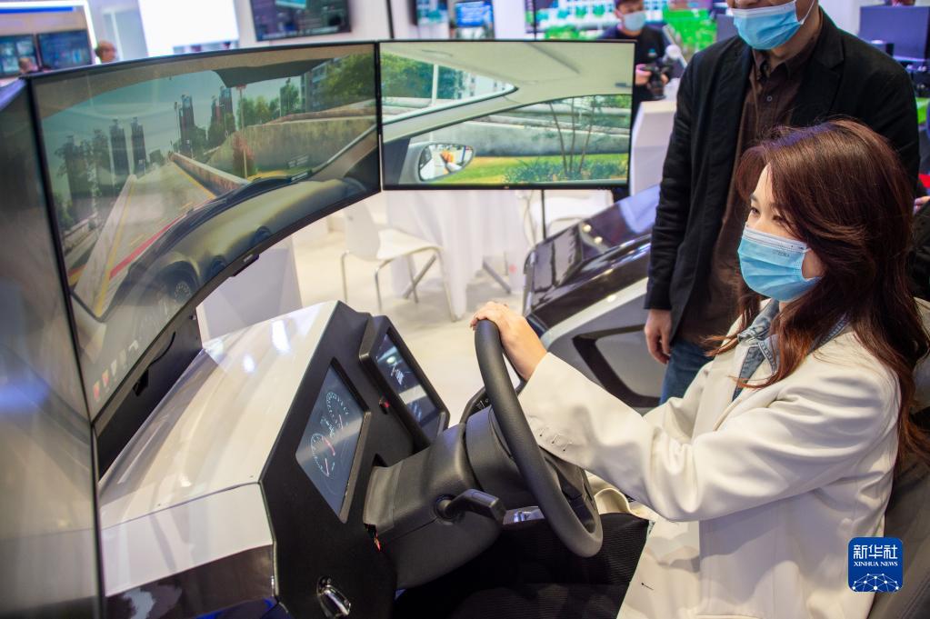11月19日至21日,2021中國5G+工業互聯網大會在位于武漢的中國光谷科技會展中心舉行。這是 11月19日,參觀者在“5G+工業互聯網成果展”上體驗駕駛智能模擬器。新華社發(伍志尊 攝)