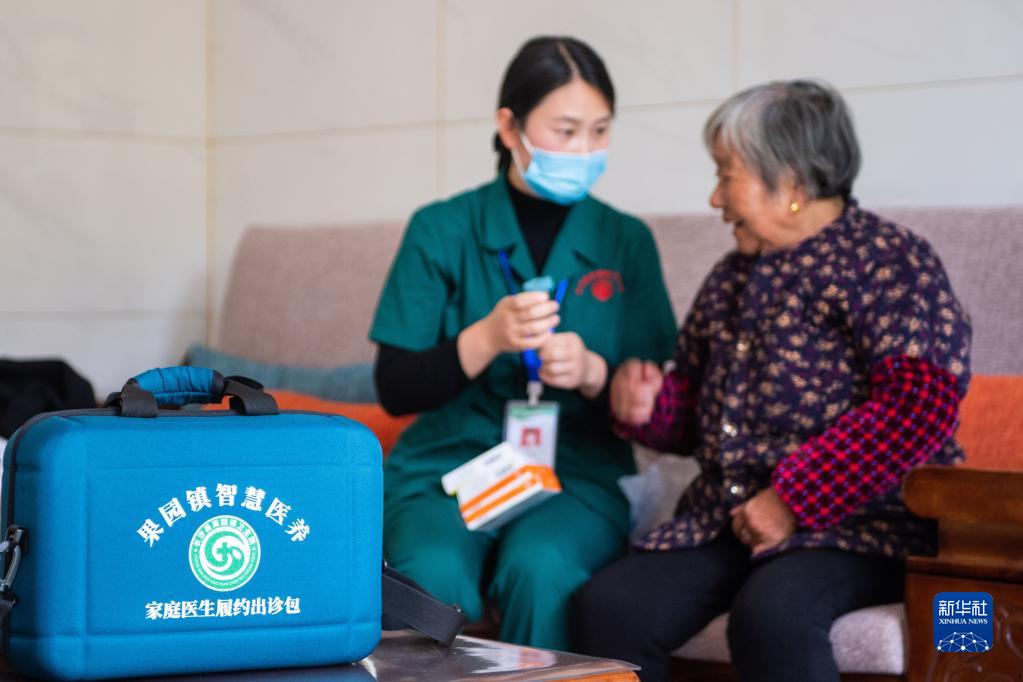 11月12日,在湖南省長沙市長沙縣果園鎮楊泗廟社區,醫務人員劉敏指導居家老人用藥。新華社記者 陳思汗 攝