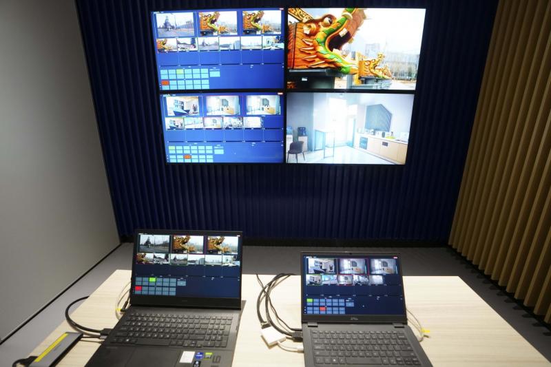 整個測試賽的“雲上制作中心”其實就位于雲轉播科技公司的首鋼辦公區,一臺筆記本、一個屏幕就完成了“雲上制作中心”的搭建。據北京國際雲轉播科技有限公司相關負責人介紹,當前端信號通過5G背包傳來後,導播人員在辦公區可以統一完成多畫面的導切、音頻及字幕的制作,最後將信號分發到多個媒體進行直播。