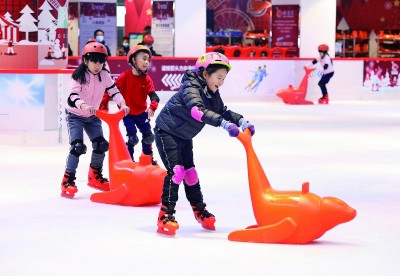 1月23日,小朋友們在河北省石家莊市裕華區歡樂匯商場的滑冰場玩耍。新華社發