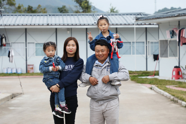 楊興義一家四口在板房宿舍前合影(1月25日攝)。新華社記者王瑞平攝