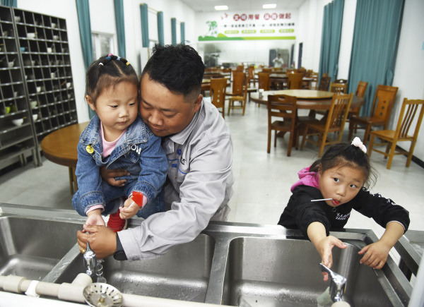 從施工現場回來,楊興義在食堂為小女兒洗手(1月24日攝)。新華社記者田建川攝