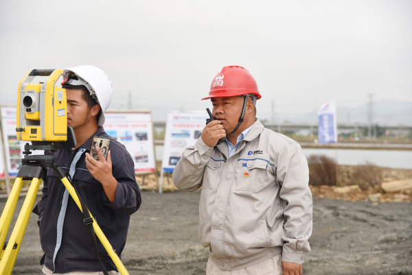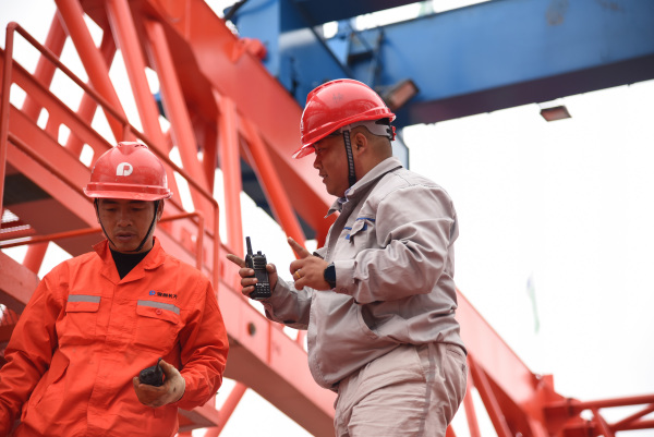 楊興義(右)在施工現場指引設備下樁(1月25日攝)。新華社記者田建川攝