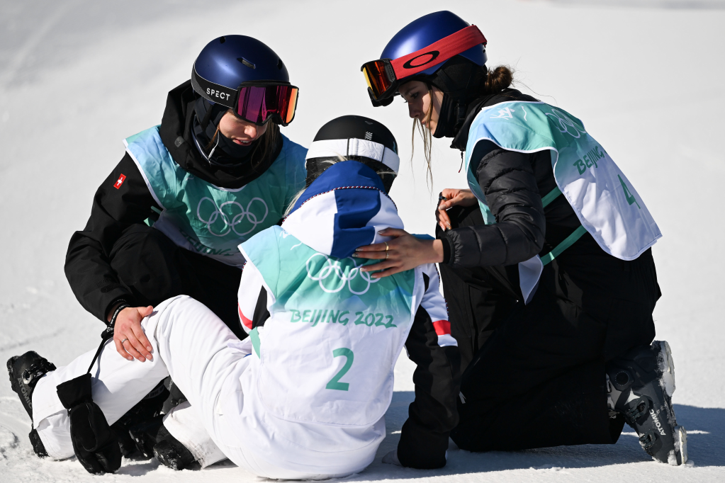 2月8日,谷愛淩(右)和瑞士選手瑪蒂爾德·格雷莫德(左)在比賽後安慰法國選手苔絲·勒德。新華社記者薛宇舸攝