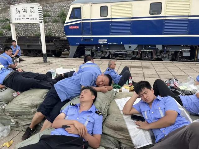 站臺上,北京車輛段勞人科賈科長在地上鋪上塑料布,躺在上面就睡著了。據他身旁的工作人員介紹,8月2日淩晨,北京局集團有限公司組織北京動車段、北京車輛段等單位的200多名職工連夜馳援斜河澗站,每人背著飲用水、食品徒步6小時,于當日中午抵達安家莊,將救援物資由村委會分發給滯留旅客。“雖然這一路很累,但我們覺得這是值得的。穿了這身鐵路制服,就要盡到這份責任。”
