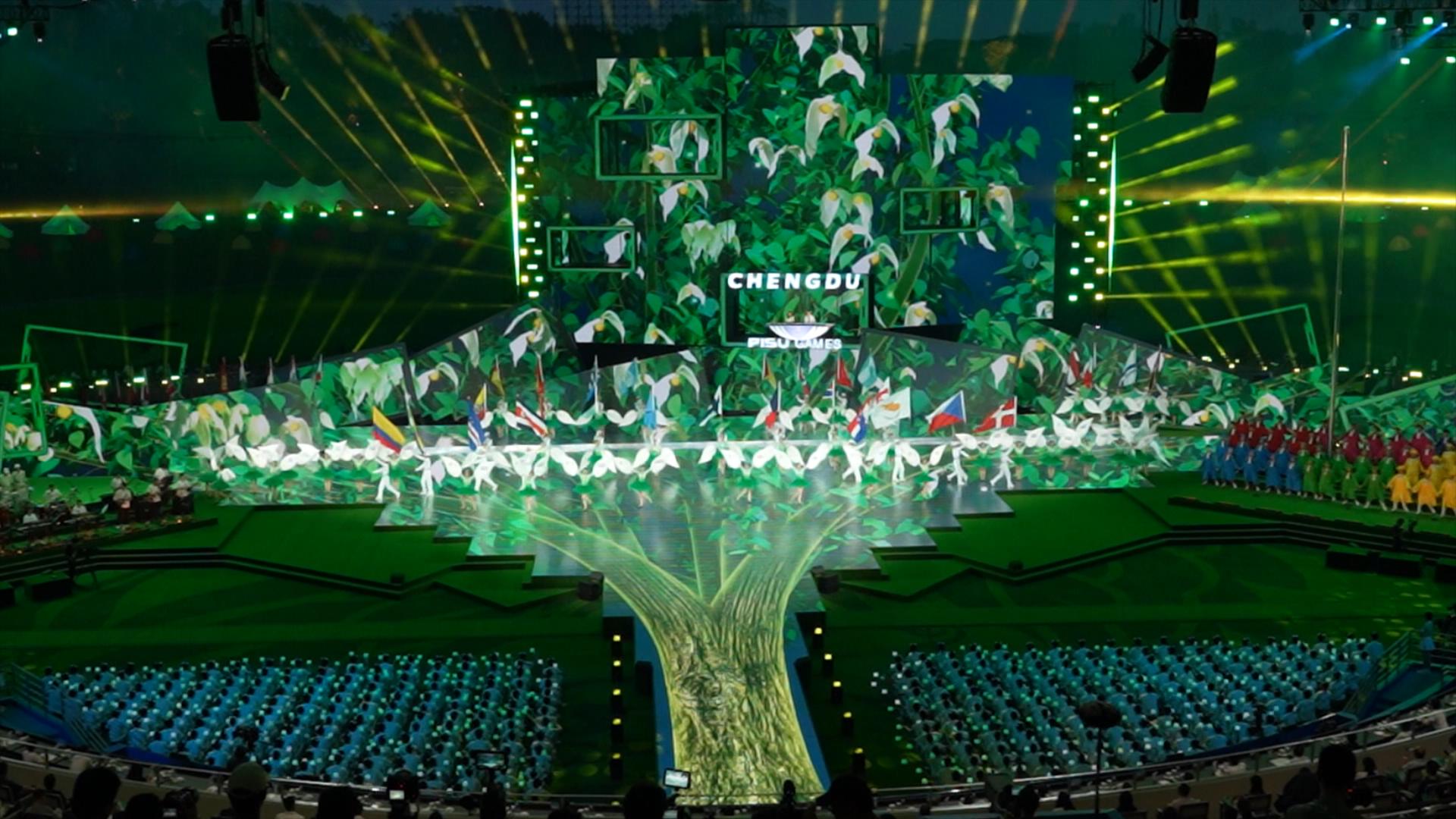 “不止珙桐樹,還有太陽神鳥,3D蓉寶的亮相,每一個出現在閉幕式舞臺上的視覺元素都是極具情感,有視覺語言的,我們的小野心就是希望所有的運動員和觀眾拿起手機不停地拍拍拍。”楊多分享,用帶有情節的美術分鏡,形成視覺呈現上獨特的語言體係,而並不是單單將屏幕作為多媒體裝飾的載體,這也是成都大運會閉幕式上在視覺效果呈現上一個極大的創新。