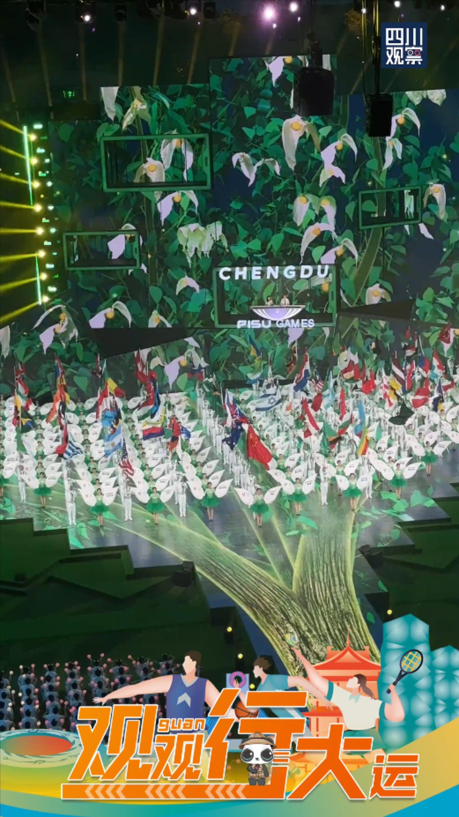 一株來自6000萬年前,被譽為“植物界的大熊貓”的植物——珙桐樹以裸眼3D的形態出現在成都大運會閉幕式的舞臺上,從觀眾身邊一直延伸到主屏幕。珙桐花開時,其花序圓似鳥頭,苞片潔白碩大如翅,宛如展翅欲飛的白鴿,故得名“鴿子花”,寓意著“和平友好”。113支參賽隊伍入場,象徵著和平的朵朵鴿子花競相開放。