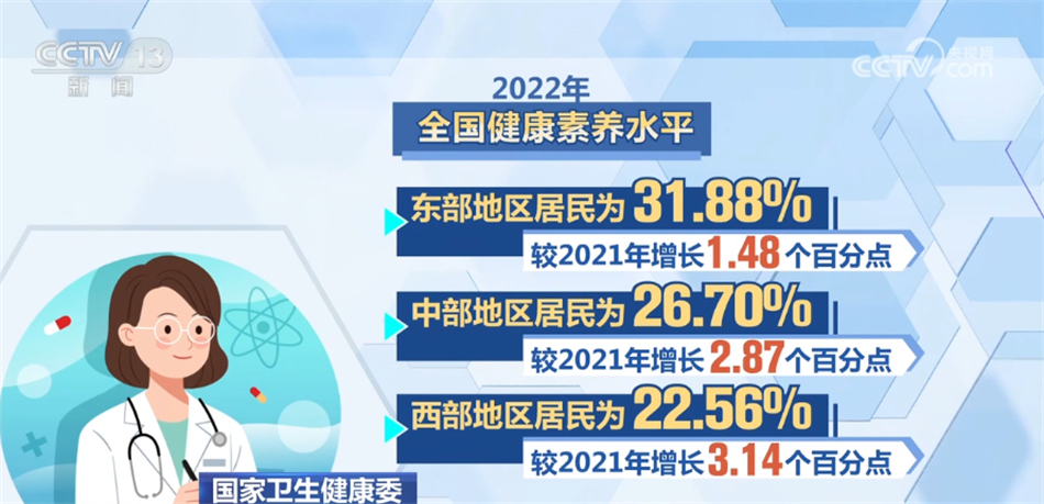 監測結果顯示,2022年,全國城市居民健康素養水平為31.94%,農村居民為23.78%,較2021年分別增長1.24和1.76個百分點。東、中、西部地區居民健康素養水平分別為31.88%、26.70%和22.56%,較2021年分別增長1.48、2.87和3.14個百分點。城鄉居民基本知識和理念素養水平為41.26%,健康生活方式與行為素養水平為30.63%,基本技能素養水平為26.00%,較2021年分別提升3.60、2.58、1.72個百分點。