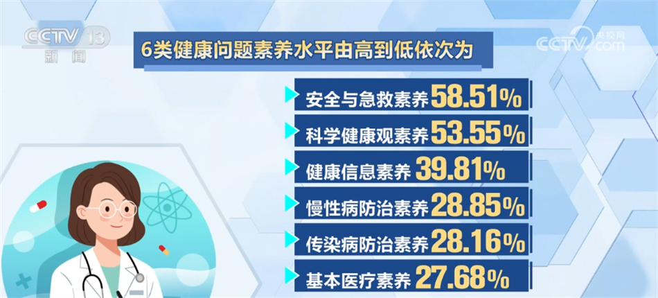6類健康問題素養水平由高到低依次為:安全與急救素養58.51%、科學健康觀素養53.55%、健康信息素養39.81%、慢性病防治素養28.85%、傳染病防治素養28.16%和基本醫療素養27.68%。各類健康問題素養均有不同程度提升,其中,健康信息素養水平增幅最大,較2021年提升了3.88個百分點。本次監測覆蓋31個省(自治區、直轄市)的336個縣(區)1008個鄉鎮(街道),對象為15—69歲常住人口。