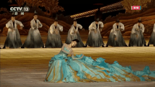身著藍色衣裙的舞者,在呈現錢塘江兩岸風情景色水墨畫卷上起舞。隨著舞者舞步的移動,閃閃波紋將水墨畫逐漸擦去。