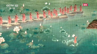 隨著場景變換,整個場地內呈現出一片湖光山色。一片碩大的荷葉在水面綻開,江南採蓮、蓮葉田田,為我們展示了《煙雨染江南》如詩如畫的美景。