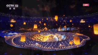 湖光山色又變幻成為雄偉寬闊的京杭大運河,遊船駛入大運河,不遠處,就是杭州拱宸橋。燈籠飛起,祝福滿天,《燈火耀古今》。在這一刻,古今相會,四海同心,友誼長存。