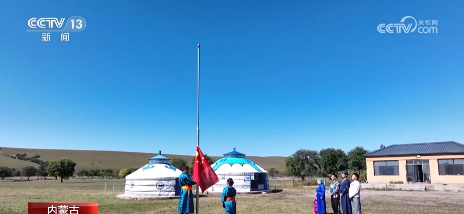 當清晨的陽光照亮草原,牧民霍高娃夫妻倆開始忙碌起來,每年的國慶期間,他們都會自發的舉行升國旗儀式。2023年,他們還邀請了周邊的牧民朋友一起,參與這個莊嚴的儀式。興安盟科右前旗滿族屯滿族鄉是內蒙古自治區19個民族鄉之一,這里的牧民世代生活在邊境線上。2022年,滿族屯滿族鄉為156戶邊境牧民,修建了規范儀式標準的升旗臺,讓五星紅旗冉冉升起在祖國北疆的邊境線上。