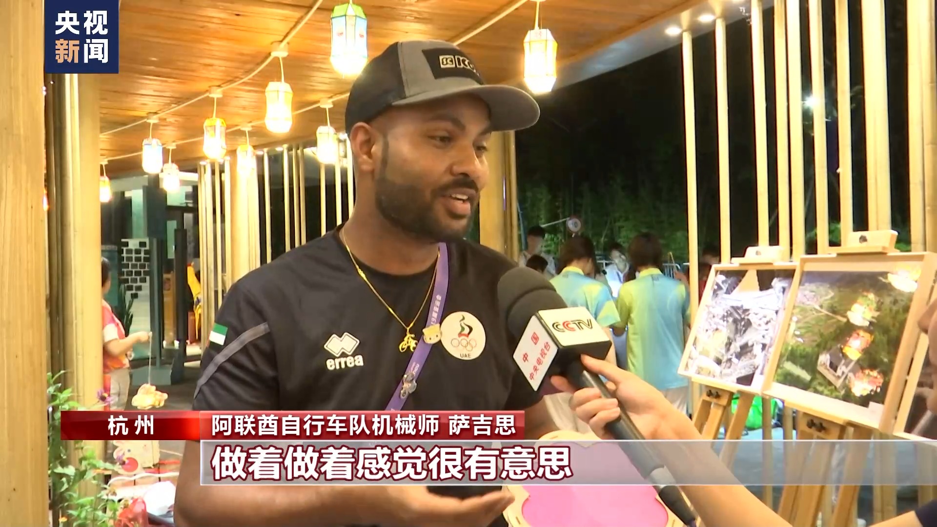 竹編、剪紙、茶藝······在杭州亞運會淳安亞運分村的非遺文化展示區,亞運會開幕以來,每晚六點半進行的中國傳統工藝展示,總是吸引著很多外國運動員、隨行團隊成員等前來觀看。來自阿聯酋自行車隊的機械師薩吉思,在老師的指導下,即將完成他的手工作品。